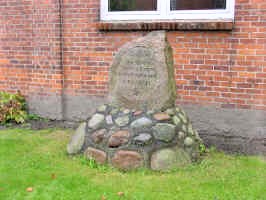 Vor dem Gemeindehaus ein Findling auf Feldsteinsockel mit Inschrift für beide Weltkriege,