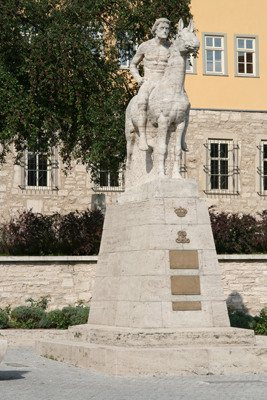 Das Ulanendenkmal, im Volksmund „Nackter Reiter“ genannt, steht auf dem Augustinerplatz vor dem Stadtmuseum,