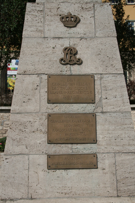 Es ist das Denkmal für die Gefallenen des Thüringer Ulanenregimentes Nr. 6. Die Krone und die Buchstaben CR mit IX weisen auf