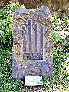 Der Stein zeigt vier stilisierte, nur angedeutete Personen. Eine kleine Metalltafel vor dem Stein gibt knappe Informationen zu dem historischen Hintergrund.