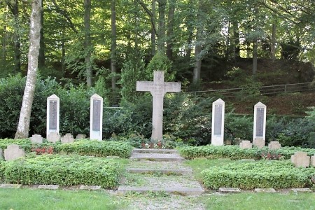 Im Friedhof: Denkmal bestehend aus vier dreieckigen Säulen und in der Mitte ein Hochkreuz, zusätzlich Daten von privaten Gedenksteinen.