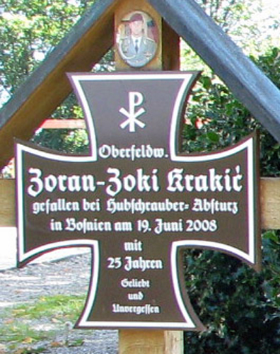 sowie einen im Auslandseinsatz der Bundeswehr gefallenen Soldaten. An vier Kreuzen fehlen Namen.