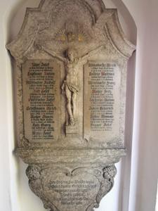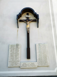 An der Außenwand, auf zwei Steinplatten zu beiden Seiten eines Kruzifixes, sind die Namen der Gefallenen des 2. Weltkriegs verzeichnet.