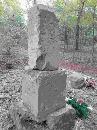 Denkmal für die Gefallenen des Ersten Weltkriegs: Beschädigte Reste einer ehemaligen abgestuften Stele auf dem ehemaligen evangelischen Friedhof im Wald nördlich des Dorfes.