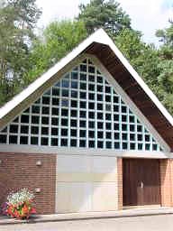 Die Gedenkstätte befindet sich an der Vorderfront der Friedhofkapelle: Durch ein Kreuz werden vier Felder gebildet, in die weiße Steintafeln eingelassen sind.