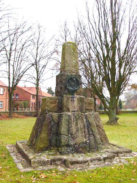 Ortsmitte neben der Kirche: Obelisk aus aufeinandergestellten, bearbeiteten Findlingen. An zwei Seiten befinden sich in halber Höhe Metallmedaillons. Eins zeigt einen pflügenden Bauern vor der Silhouette eines Dorfes, das andere einen knienden Soldaten ohne Kopfbedeckung, der in der rechten Hand ein Gewehr, in der linken einen Kranz hält. Darunter stehen die Jahreszahlen „1914-1918“. Die Namenstafeln wurden offenbar entfernt und an der Wand der Friedhofskapelle angebracht.