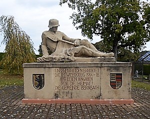 Vor dem Friedhofeingang, rechteckiges Denkmal mit einem darauf sitzenden Soldaten, mit Inschrift der Gemeinde und Wappen von Bernbach und Württemberg.