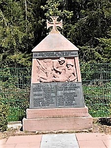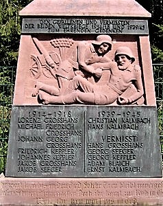 Eine Tafel mit den Namen der Gefallenen und Vermissten beider Kriege. Auf dem oberen Sockel der Spruch: Ihr wart treu bis in den Tod.