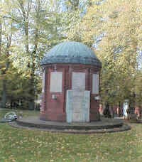 Ziegelrundbau mit Kupferkuppel, Marmorgedenktafel und Tafeln mit Namen der Gefallenen des Ersten Weltkrieges.