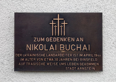 BUCHAI | Nikolai | 27.09.1914 Dnijepropetrowski | April 1944 23.03.1944 | ZUM GEDENKEN AN BUCHAI NIKOLAI DER UKRAINISCHE LANDARBEITER IST IM APRIL 1944 IM ALTER VON ETWA 30 JAHREN BEI BINSFELD AUF TRAGISCHE WEISE UMS LEBEN GEKOMMEN STADT ARNSTEIN „im Streit um seine Uhr erschlagen von zwei Russen“ - Arolsen Archiv - Name: BUCHEI |