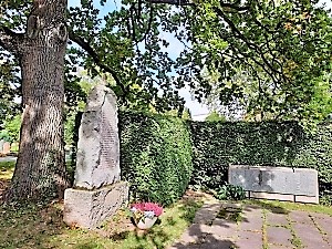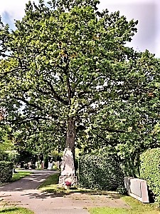 Friedhof: Grob behauener Naturstein auf einem steinernen Sockel unter einer mächtigen Eiche. Daneben eine aufgestellte Metalltafel