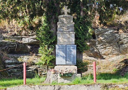 Altes Steindenkmal mit nachträglich angebrachten Tafeln für beide Weltkriege.