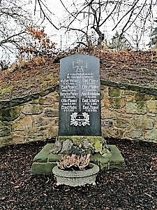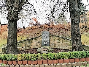 Denkmal für die Gefallenen des Ersten Weltkrieges, angelegt zwischen zwei Bäumen mit einer steinernen Mauer im Hintergrund.