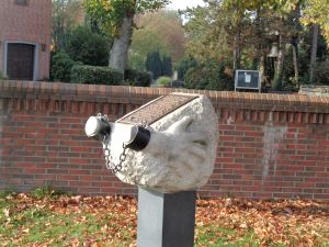 Vor dem Friedhof in Brake steht eine Plastik (gefesselte Hände) für dort bestattete Zwangsarbeiterinnen und Zwangsarbeiter.