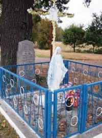 Gut erhaltenes kleines Denkmal für die Gefallenen des Ersten Weltkriegs auf dem Dorfplatz vor einer alten Eiche und hinter einem mit Zaun umrandeten christlichen Kreuz.