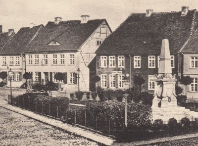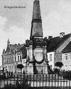 Ehemaliges Denkmal für die Gefallenen des Krieges 1870/71 auf dem Marktplatz: Abgestufter Obelisk mit eingelassenen Widmungs- und Namensflächen. An den Ecken waren bis zum Absatz in der Mitte Säulen angebracht, auf denen vier Adler-Figuren ruhten. Das Denkmal wurde nach 1945 abgerissen.