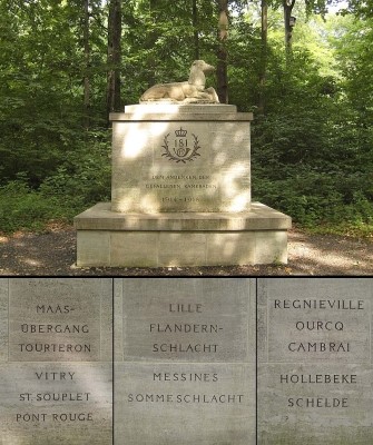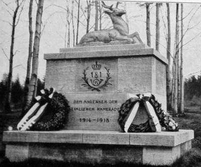Ehemaliges Denkmal für die Gefallenen des 5. königlich sächsischen Infanterie-Regiments Nr. 181 im Zeisigwald: Quader mit Inschriften, darauf die Figur eines Hirsches. Auf der Rückseite befinden sich die Namen von Schlachtorten.