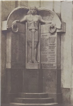 Das Eckdenkmal aus französischem Kalkstein für den Innenraum wurde im Jugendstil mit der zentralen Skulptur des geflügelten Erzengels St. Michael geschaffen. Er ist in Rüstung mit einem Schwert, Spitze nach unten, vor seinem Körper und einem Kranz in jeder Hand. Diese liegen zusammen mit den Unterarmen schützend über den Seitentafeln mit 91 Namen von gefallenen Bürgern der Stadt Chiesch und der umliegenden Dörfer: Protiwitz, Walkowa, Badstübl, Mokrau, Poritsch, Sicheritz, Lub.
