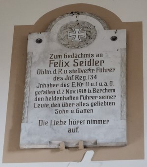 In der Kirche des Ortes befindet sich eine marmorne Gedenktafel für den im Ersten Weltkrieg gefallenen Felix Seidler. Im oberen Halbrund ist ein Eisernes Kreuz im Eichenkranz und an den Seiten sind zwei Lorberranken neben der Schrift plastisch hervorgehoben.