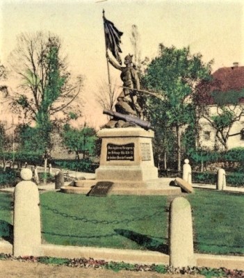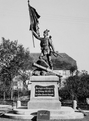 Ehemaliges Denkmal für die Gefallenen der Kriege 1866 und 1870/71: Abgestufter Quader mit eingelassenen Widmungs- und Namenstafeln, darauf das Bronze-Standbild eines Soldaten mit Pickelhaube, Gewehr und Fahne, der über einer zerschossenen Kanone steht. Das Denkmal wurde nach 1945 abgerissen.