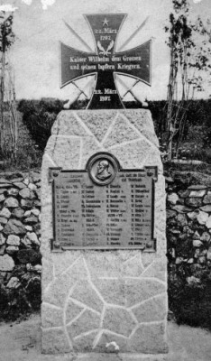 Ehemaliges Denkmal für die Teilnehmer der Einigungskriege 1864, 1866 und 1870/71: Aus Steinblöcken gemauerte Stele mit krönendem Eisernen Kreuz mit gekreuzten Schwertern. An der angebrachten Widmungs- und Namenstafel war ein Portrait Kaiser Wilhelms I. angebracht. Das Denkmal verschwand nach 1945.