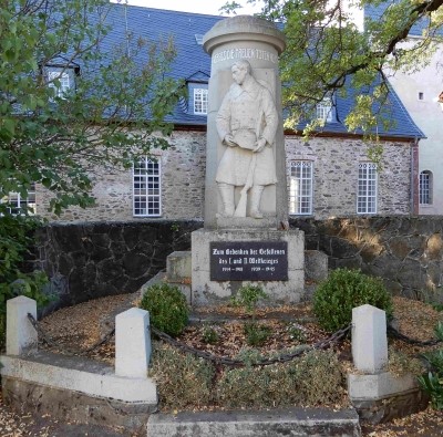 Denkmal für die Gefallenen des Ersten Weltkriegs an der Kirche: Dreistufiger Sockel, darauf eine runde Stele mit großem Relief eines trauernden Soldaten mit Stahlhelm in den Händen und angelehntem Gewehr. Die ursprünglich unten angebrachte Tafel wird heute überdeckt von einer neuen Tafel zum Gedenken an die Opfer des Ersten und Zweiten Weltkriegs (ohne Namen).