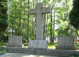 Großes Steinernes Kreuz. Darunter drei Granitplatten, eine für den 1. Weltkrieg, zwei für den 2. Weltkrieg