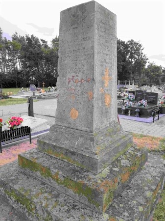 Durch verschiedene Beschädigungen und Farbe ist das Denkmal teilweise schwer oder nicht mehr lesbar. Aus diesem Grund bestehen bei der Abschrift der Daten Unsicherheiten. Die vordere Widmung wurde sogar absichtlich herausgeschlagen. Man erkennt aber noch die meisten Konturen.