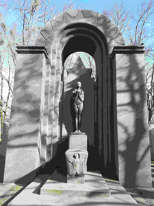Staatsbegräbnis hier bestattet wurde. Auf dem Sarkophag steht eine nackte Männerfigur mit einer