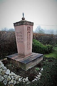 Auf dem Friedhof steht ein ca. 1,5 m höher roter Stein. Die Vorderseite zeigt ein Relief mit Schwert und Eichenlaub.