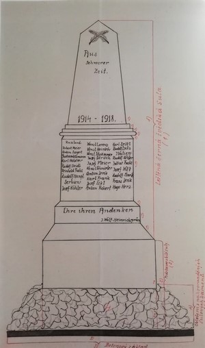 Das Denkmal hatte die Form eines Obelisken aus schwarzem, poliertem Granit, der auf einem Granitsockel und einem Betonsockel stand. An der Spitze waren gekreuzte Palmenzweige und die Aufschrift „Aus schwerer Zeit“. In der Mitte stand das Jahr 1914-1918 und die Namen von 26 Gefallenen, aufgeteilt nach Todesländern (Russland, Serbien, Italien). Unten stand die Inschrift „Ehre ihren Andenken“ und die Unterschrift des Steinmetzes. Es wurde bisher lediglich eine Zeichnung des Denkmals gefunden.