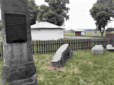 Mehrere Stelen, die früher Punkte des Schlachtfeldes markierten, heute zusammen aufgestellt und abgelegt am Museum der Schlacht am Ortsrand.