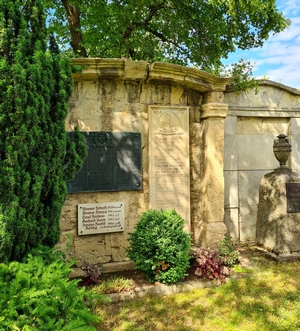 Rechts innen, neben dem Eingang des Friedhofes der Stadt sind an der Mauer Tafeln angebracht.