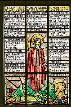sowie über dem Christus die Namen der Opfer des Krieges in der Reihenfolge der Todesjahre verzeichnet.