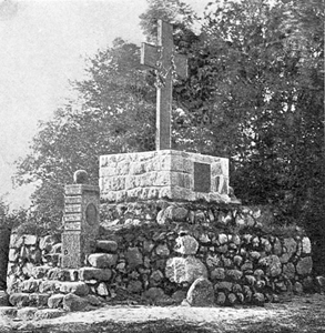 Sogenanntes Landwehrkreuz zum Gedenken an den Befreiungskrieg 1813-1815, nordwestlich von Königsberg, geschaffen von Königsberger Studenten und Bürgern. Dreistufiger massiver Unterbau aus Feld- und Natursteinen mit einem aufgesetzten christlichen Kreuz aus Eisen (vernichtet).