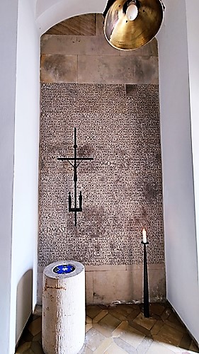 Eine deckenhohe Steintafel in einer Nische im Eingangsbereich der Johanneskirche erinnert an die Gefallenen beider Weltkriege.