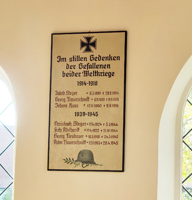 Hölzerne Gedenktafel in der Kapelle für beide Weltkriege.