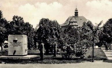 Ehemaliges Denkmal für die Gefallenen des Ersten Weltkriegs in Eilenburg: Auf einem Platz (damals Hermann-Göring-Ring) stand ein einfacher Quader mit Stahlhelm-Relief und Widmung.