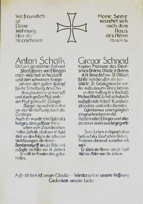 Gedenktafel in der Stadtpfarrkirche St. Georg für Anton Schalk, den Pfarrer von Ellingen, der an den Folgen des Bombenangriffs starb.