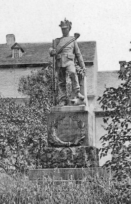 Ehemaliges Denkmal für die Gefallenen des Krieges 1870/71: Mehrstufiger Sockel, darauf ein Quader mit Inschriften und Ehrenkranz und krönendem Standbild eines Soldaten mit Gewehr und einer Pickelhaube mit Eichenlaub als Schmuck. Das Denkmal wurde nach 1945 abgerissen.