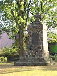 In der alten Dorfmitte steht ein Steindenkmal mit Kreuz, umgeben von hohen Eichen.