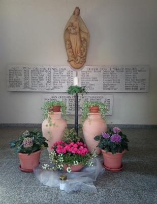 An der Rückwand drei Tafeln mit den Namen und Todestag/-ort der Gefallenen und Vermissten beider Weltkriege.