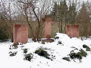 Daneben, zu beiden Seiten eines Kreuzes, Gedenksteine aus rotem Stein für den 2. Weltkrieg.