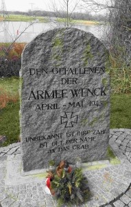 Stein zum Gedenken an die Toten der Armee Wenck und die Opfer des Rückzuges über die Elbe 1945 an der Fähranlegestelle des Ortes.