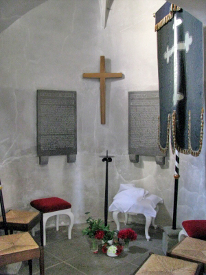 Zwei Gedenktafeln in einem kleinen Seitenraum der Kirche St. Kilian. Zwischen den Tafeln hängt ein Holzkreuz.