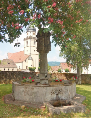 Kriegerdenkmal in Form eines Brunnens am Friedhof in der Hausener Straße: