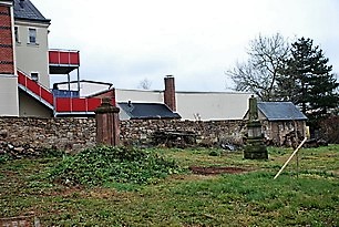 Auf dem Hof der Kirche stehen zwei verwahrloste Denkmale hinter einem Abfallhaufen.