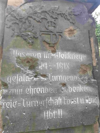 Denkmal für die Gefallenen des Turnvereins im Ersten Weltkrieg: Abgestufter Sandsteinquader mit gerundetem Dachaufsatz. Teile des Denkmals sind weggebrochen und es befinden sich Einschüsse darin.