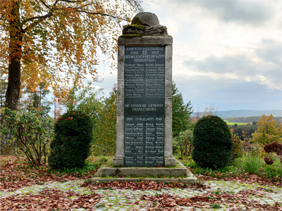 Denkmal mit krönendem Stahlhelm am Ortsausgang für beide Weltkriege.