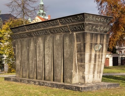 Denkmal aus Sandstein auf dem Bebelplatz für die Gefallenen des Res.-Jäg.-Batl. 26 im Ersten Weltkrieg. Es hatte die Form eines Sarkophages mit je sieben Namensflächen auf jeder Seite. Es wurde ursprünglich von zwei Figuren nackter sterbender Krieger an den oberen Außenseiten gekrönt die entfernt wurden.